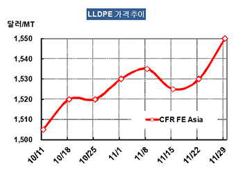 LLDPE 가격은 11월27일 CFR FE Asia 톤당 1550달러로 20달러 급등했다.