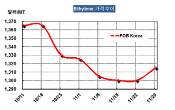 에틸렌 가격은 11월29일 FOB Korea 톤당 1315달러로 15달러 상승했다.