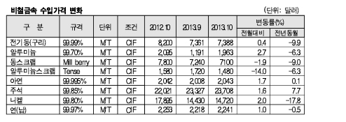 표, 그래프: < 비철금속 수입가격 변화 > <화학저널 2013/12/03> |
