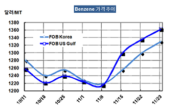 벤젠 가격은 11월29일 FOB Korea 톤당 1329달러로 30달러 상승했다.
