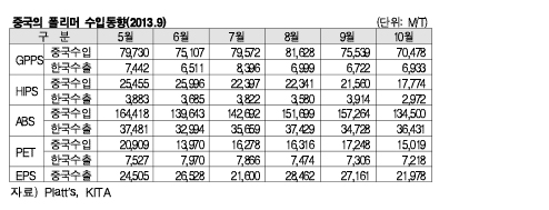 표, 그래프: < 중국의 폴리머 수입동향(2013.9) > <화학저널 2013/12/05> |