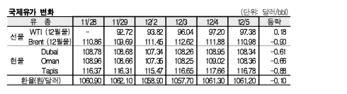 12월5일 국제유가는 유로존 경기회복 둔화 전망으로 하락했다.