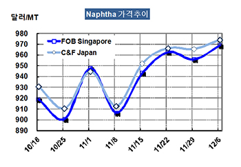나프타 가격은 12월6일 CFR Japan 톤당 974달러로 9달러 상승했다.