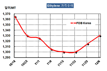 에틸렌 가격은 12월6일 FOB Korea 톤당 1330달러로 15달러 상승했다.