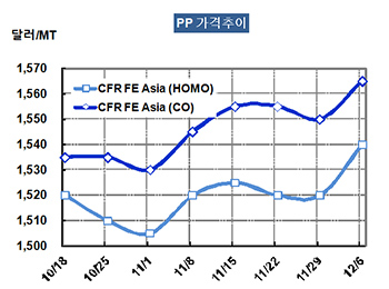 PP 가격은 12월4일 CFR FE Asia 톤당 1540달러로 20달러 급등했다.
