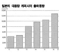 일본은 대용량 캐퍼시터 출하액이 2013년 80억4500만엔으로 전년대비 72.3% 폭증할 것으로 예상된다. 표, 그래프: < 일본의 대용량 캐퍼시터 출하동향 > <화학저널 2013/12/18> |
