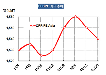 LLDPE 가격은 12월18일 CFR FE Asia 톤당 1540달러로 10달러 하락했다.