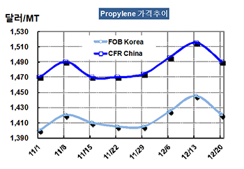 프로필렌 가격은 12월20일 FOB Korea 톤당 1420달러로 25달러 하락했다.