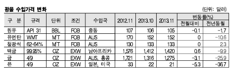 표, 그래프: < 광물 수입가격 변화 > <화학저널 2013/12/27> |