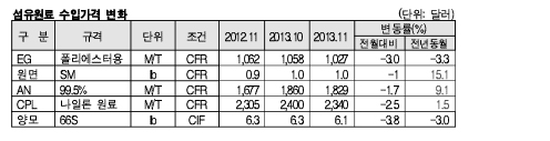 표, 그래프: < 섬유원료 수입가격 변화 > <화학저널 2013/12/27> |
