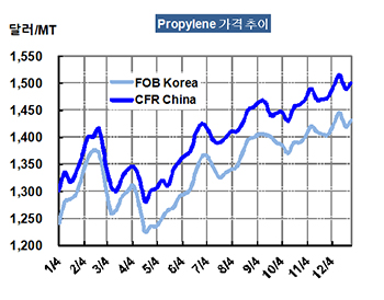 프로필렌 가격은 2013년 12월27일 FOB Korea 톤당 1430달러로 마무리했다.