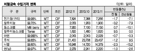 표, 그래프: < 비철금속 수입가격 변화 > <화학저널 2014/01/03> |