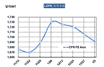 LDPE 가격은 1월1일 CFR FE Asia 톤당 1690달러로 15달러 하락했다.