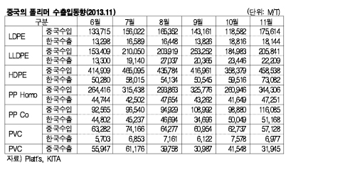 표, 그래프: < 중국의 폴리머 수출입동향(2013.11) > <화학저널 2014/01/06> |