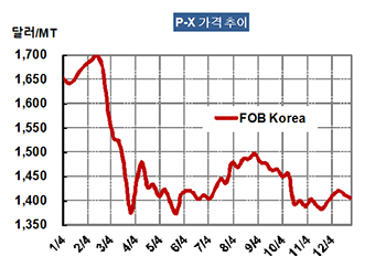 P-X(Para-Xylene) 가격은 2013년 FOB Korea 톤당 1400달러대에서 거래를 마감했다.