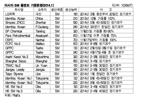 표, 그래프: < 아시아 SM 플랜트 가동현황(2014.1) > <화학저널 2014/01/15> |