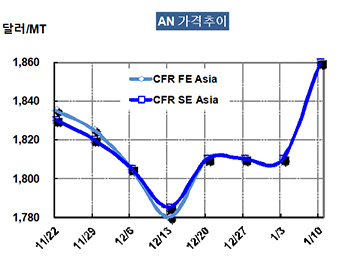 AN 가격은 1월14일 CFR FE Asia 톤당 1860달러로 50달러 급등했다.