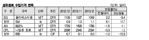 표, 그래프: < 섬유원료 수입가격 변화 > <화학저널 2014/01/27> |
