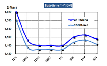 부타디엔 가격은 1월24일 FOB Korea 톤당 1465달러로 20달러 하락했다.