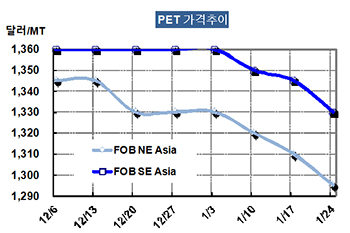 PET 가격은 1월22일 Bottle 그레이드 기준 FOB NE Asia 톤당 1295달러로 15달러 하락했다.