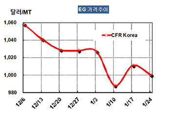 MEG 가격은 1월24일 CFR China 톤당 1000달러로 11달러 하락했다.