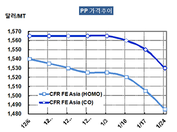 PP 가격은 1월22일 CFR FE Asia 톤당 1485달러로 20달러 급락했다.
