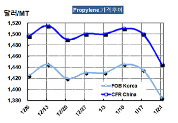 프로필렌 가격은 1월24일 FOB Korea 톤당 1385달러로 50달러 급락했다.