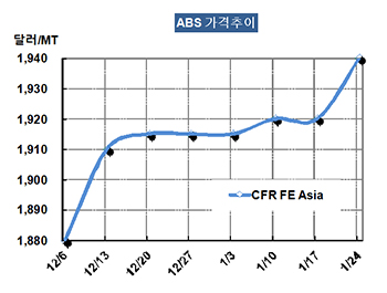 ABS 가격은 1월22일 CFR China 톤당 1940달러로 20달러 상승했다.