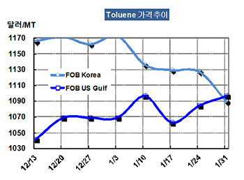 톨루엔 가격은 1월31일 FOB Korea 톤당 1090달러로 37달러 하락했다.