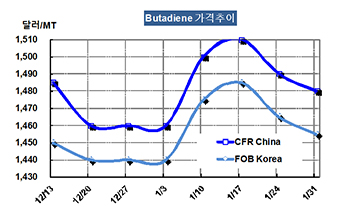 부타디엔 가격은 1월31일 FOB Korea 톤당 1455달러로 10달러 하락했다.