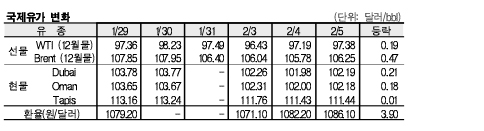 2월5일 국제유가는 미국의 원유 재고 감소와 주요국의 경지지표 호조 영향으로 상승했다.