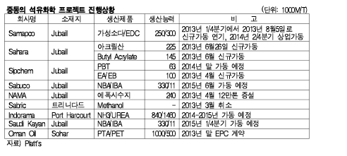 표, 그래프: < 중동의 석유화학 프로젝트 진행상황 > <화학저널 2014/02/14> |