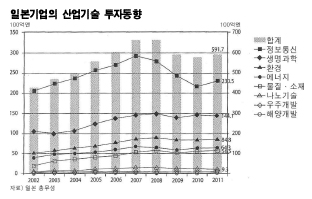 ![]() 일본 경제산업성이 발표한 <산업기술에 관한 연구개발 동향> 보고서에 따르면, 2010년 세계 연구개발비는 총 1조2191억달러로 전년대비 3.8% 증가한 가운데 미국이 4090억달러로 전체의 33.5%, 중국이 1780달러로 14.6%, 일본이 1410억달러로 11.6%를 차지했다. 미국은 2001년 비율이 40.0%에 달했으나 중국이 급성장함에 따라 2010년 33.5%로 하락했으며, 중국은 세계 순위가 2001년 5위에서 2009년 2위로 부상했다. 일본은 2008년까지 투자를 계속 확대해 2위를 유지했으나 2009년 급감세로 전환돼 3위로 떨어진데 이어 2010년에는 중국과의 차이가 확대됐다. ![]() 일본기업들의 연구개발비는 2011년 정보통신 2조3050억엔, 생명과학 1조4410억엔, 환경 9490억엔으로 나타났다. 대학은 생명과학이 9910억엔으로 70%를 차지했고 정보통신은 1500억엔, 물질‧소재는 1170엔 등으로 나타났다. 공공기관은 생명과학 2680억엔, 에너지 2610억엔, 우주개발 1830억엔을 나타냈다. 비영리단체는 생명과학 720억엔, 정보통신 370억엔, 환경 200억엔으로 대부분 생명과학에 주력하고 있는 것으로 나타났다. 표, 그래프: <세계 산업기술 연구개발 투자동향><일본기업의 산업기술 투자동향> <화학저널 2014/02/18> |