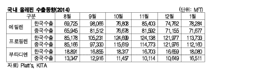 표, 그래프: < 국내 올레핀 수출동향(2014) > <화학저널 2014/02/18> |
