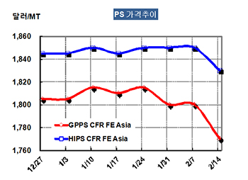 GPPS 가격은 2월12일 CFR China 톤당 1770달러로 30달러 폭락했다.