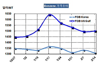 벤젠 가격은 2월14일 FOB Korea 톤당 1309달러로 25달러 하락했다.