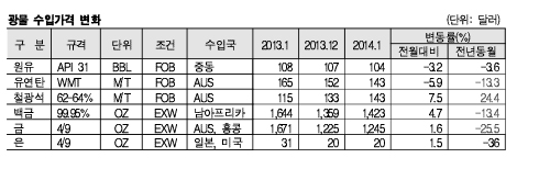 표, 그래프: < 광물 수입가격 변화 > <화학저널 2014/02/26> |
