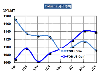 톨루엔 가격은 2월21일 FOB Korea 톤당 1093달러로 23달러 하락했다.