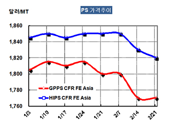 GPPS 가격은 2월19일 CFR China 톤당 1770달러로 보합세를 유지했다.