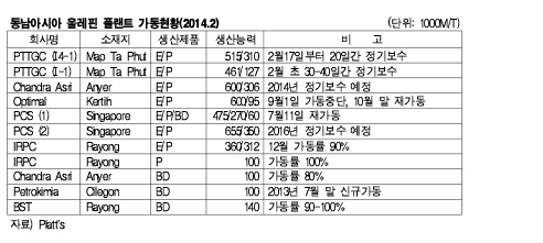 표, 그래프: < 동남아시아 올레핀 플랜트 가동현황(2014.2) > <화학저널 2014/02/28> |