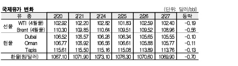 2월27일 국제유가는 우크라이나의 정정불안과 미국 경기지표 부진의 영향으로 하락했다.