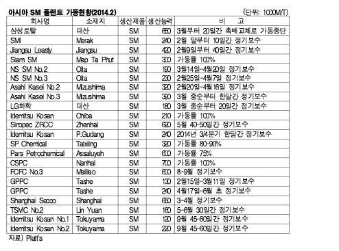 표, 그래프: < 아시아 SM 플랜트 가동현황(2014.2) > <화학저널 2014/03/03> |