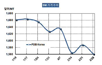 SM 가격은 2월28일 FOB Korea 톤당 1560달러로 27달러 하락했다.