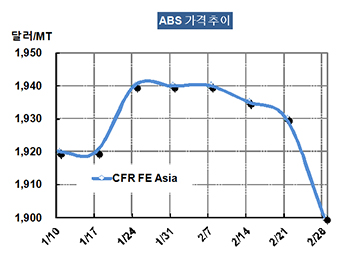 ABS 가격은 2월26일 CFR China 톤당 1900달러로 30달러 폭락했다.