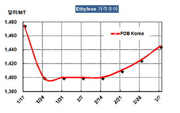 에틸렌 가격은 3월7일 FOB Korea 톤당 1445달러로 20달러 상승했다.
