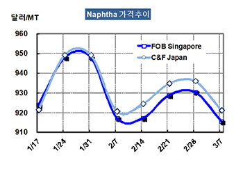 나프타 가격은 3월7일 CFR Japan 톤당 921달러로 15달러 하락했다.