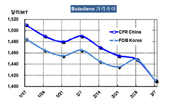 부타디엔 가격은 3월7일 FOB Korea 톤당 1410달러로 38달러 급락했다.