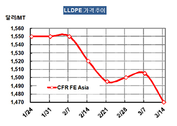 LLDPE 가격은 3월12일 CFR FE Asia 톤당 1470달러로 35달러 폭락했다.