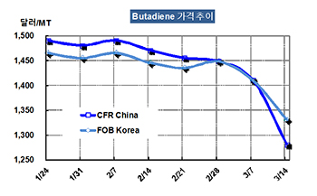 부타디엔 가격은 3월14일 FOB Korea 톤당 1330달러로 80달러 폭락했다.