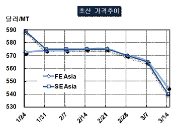 초산 가격은 3월13일 CFR FE Asia 톤당 545달러로 20달러 떨어졌다.